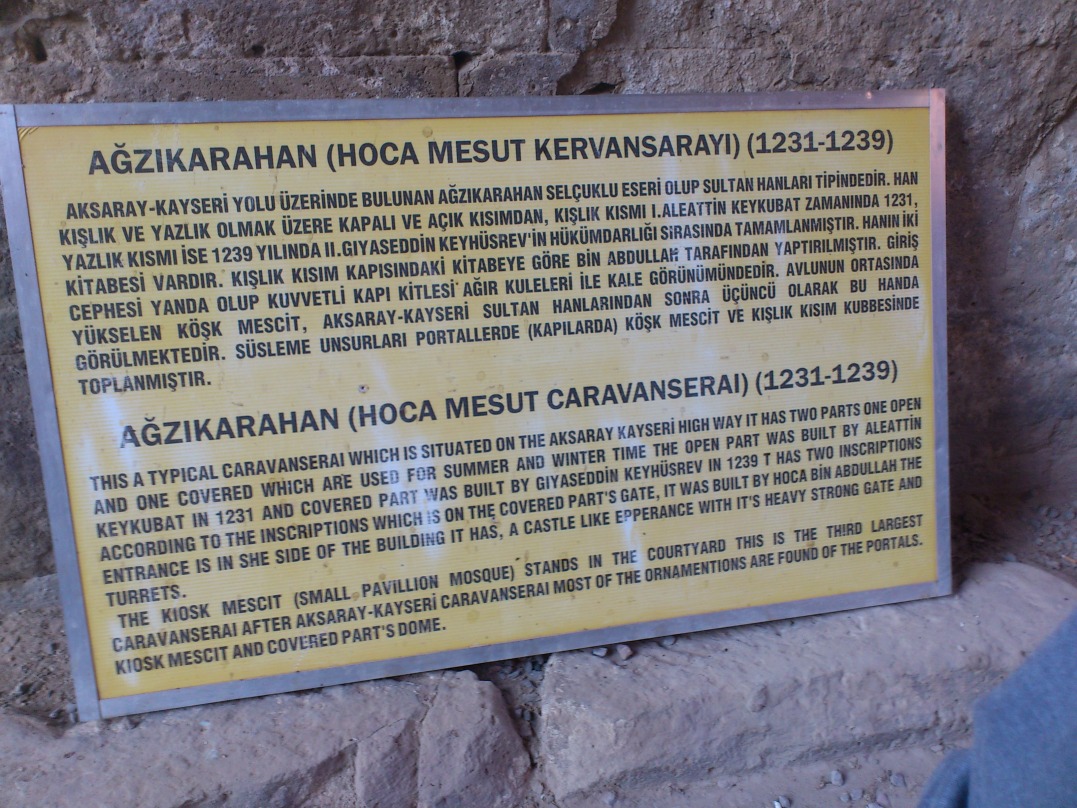 Ağzıkarahan kervansarayı içinde kervansaray hakkında Türkçe ve İngilizce bilgi veren tabela